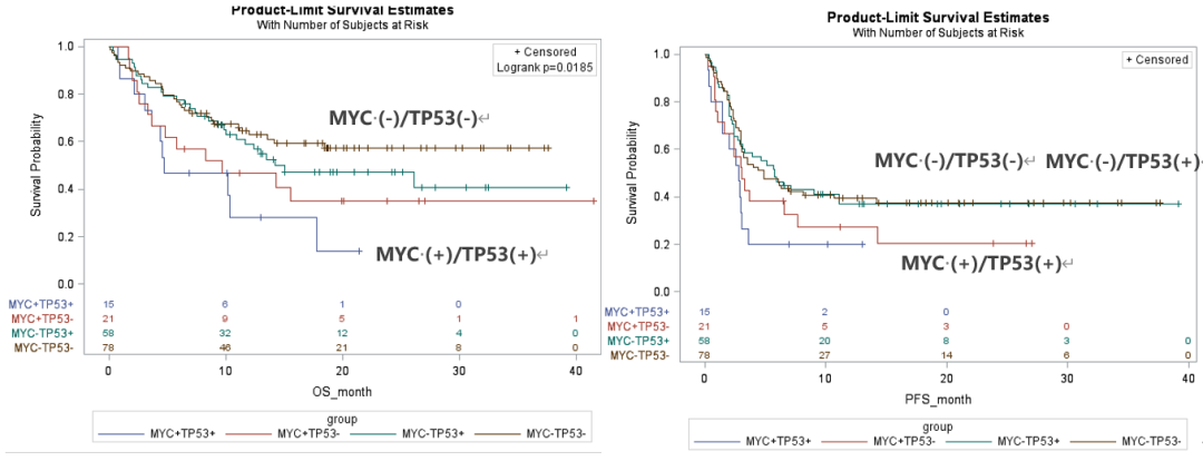 图1.基于TP53和MYC突变分型的四组R/R DLBCL患者的总体生存及无疾病进展生存